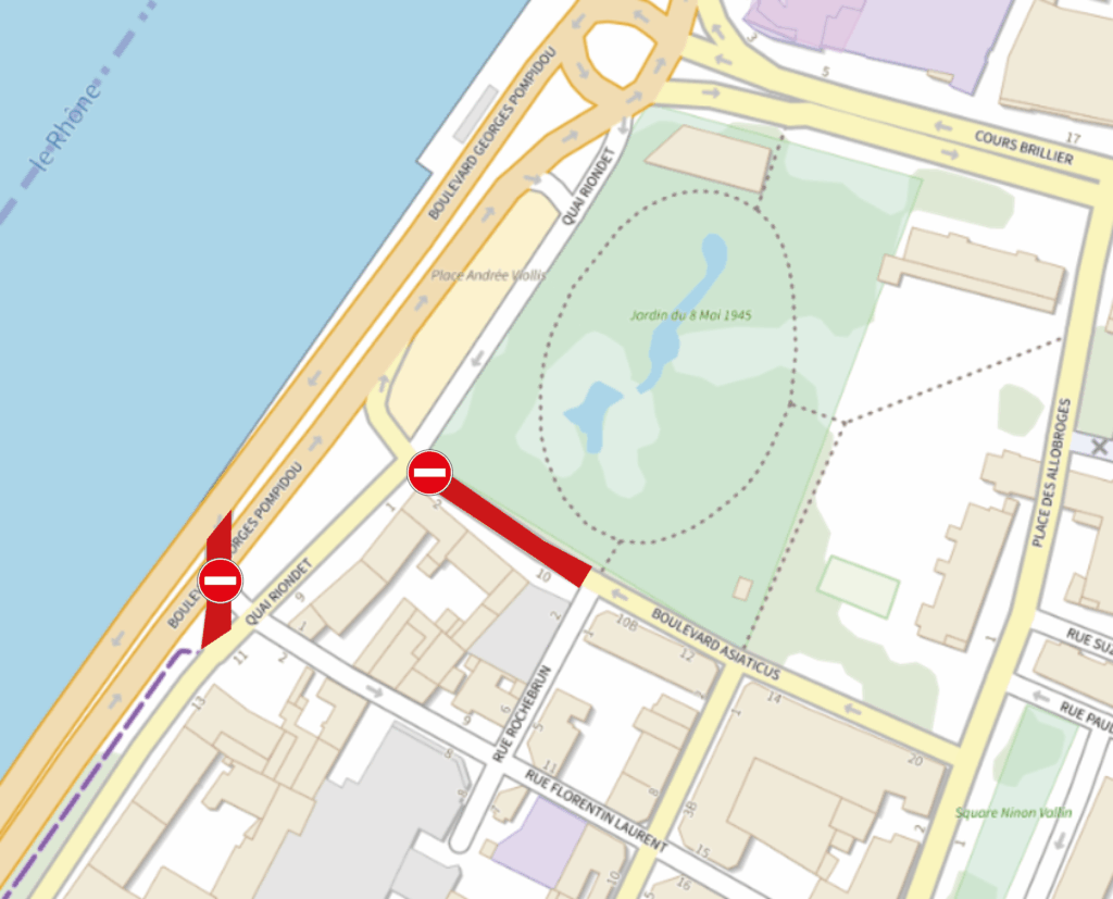 • Dans le sens Sud-Nord : interdiction de tourner à gauche sur le boulevard Georges Pompidou (quais du Rhône) en venant du quai Riondet (niveau MJC)