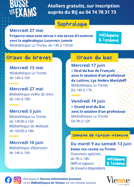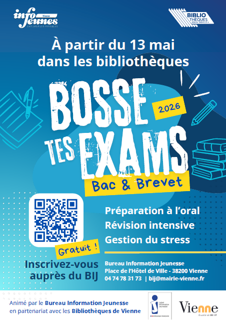 Dans la continuité de son engagement en faveur de la réussite des jeunes, le Bureau Information Jeunesse (BIJ), en partenariat avec la médiathèque Le Trente, propose le dispositif « Bosse tes exams » à partir du 13 mai, dans les bibliothèques de Vienne. Ce programme a pour objectif d’accompagner les collégiens et lycéens dans la préparation de leurs examens, notamment le brevet et le baccalauréat.