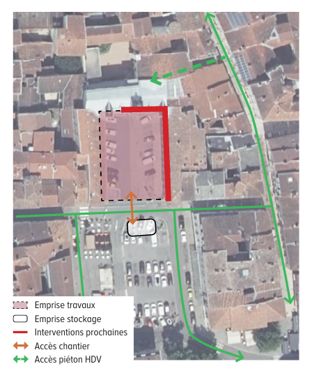 L’accès à privilégier pour gagner l’accueil de l’Hôtel de Ville pendant les travaux, se trouve à droite de la Mairie, en passant par la rue Perrouillère, la rue des Orfèvres et le portail situé au début de la rue Marchande.