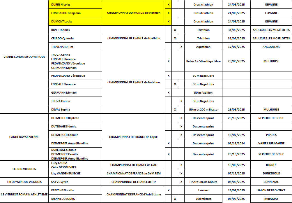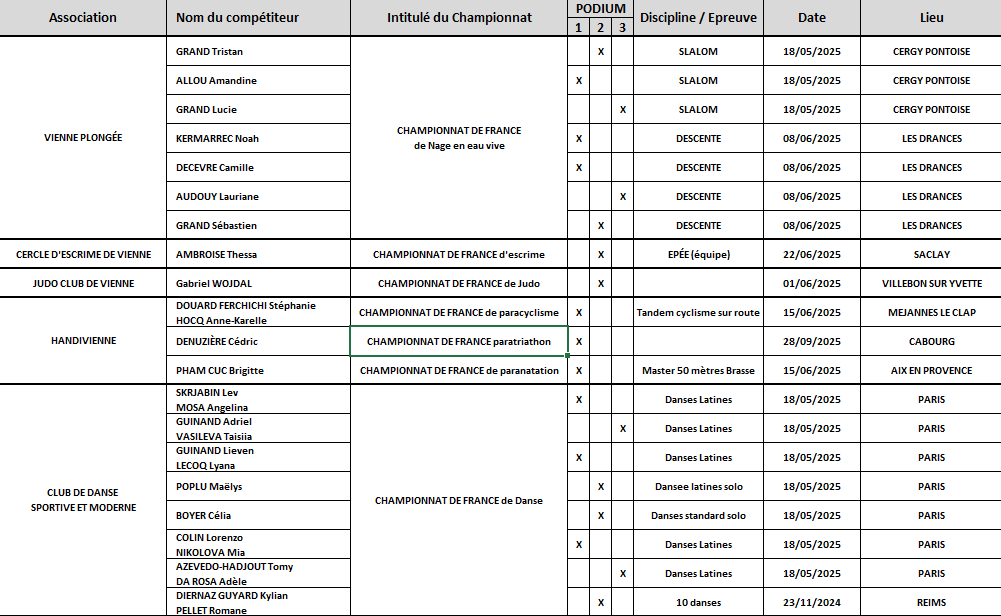 Cette année, 91 sportifs issus de 13 clubs viennois différents : Vienne Plongée, Cercle d’Escrime de Vienne, Judo Club de Vienne, Handivienne, Club de Danse Sportive et Moderne, Vienne Condrieu Olympique, Canoë Kayak Vienne, Legion Viennoise, Tir Olympique Viennois, CS Vienne St Romain Athlétisme, Sauveteurs Secouristes du Pays Viennois, Danse Team Jeanmougin et le Club Badminton Vienne, se sont vu remettre une récompense individuelle ou collective. Parmi les distinctions attribuées : 30 médailles d’or pour les championnes et champions de France, 7 trophées collectifs « or » de championnes et champions de France, 1 trophée « bronze » délivré à la Danse Team Jeanmougin pour sa 3ᵉ place au championnat du monde de bachata, et enfin 3 médailles d’or décernées à Louka DUMONT, Benjamin LOMBARDO et Nicolas DURIN pour leur 1ʳᵉ place aux championnats du monde de cross triathlon.