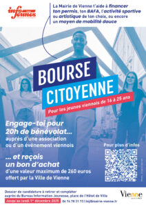 Afin d’inciter et de valoriser l’engagement des jeunes Viennois de 16 à 25 ans pour la ville, la Mairie de Vienne a mis en place la Bourse citoyenne ! En échange d’un engagement de quelques heures sur un évènement organisé et labellisé par la Ville de Vienne et/ou une association viennoise et/ou sur une proposition d’action citoyenne du jeune, un bon d’achat leur sera remis. Un coup de pouce pour financer leur permis, leur BAFA, leur licence sportive ou artistique, ou encore leur moyen de mobilité douce…